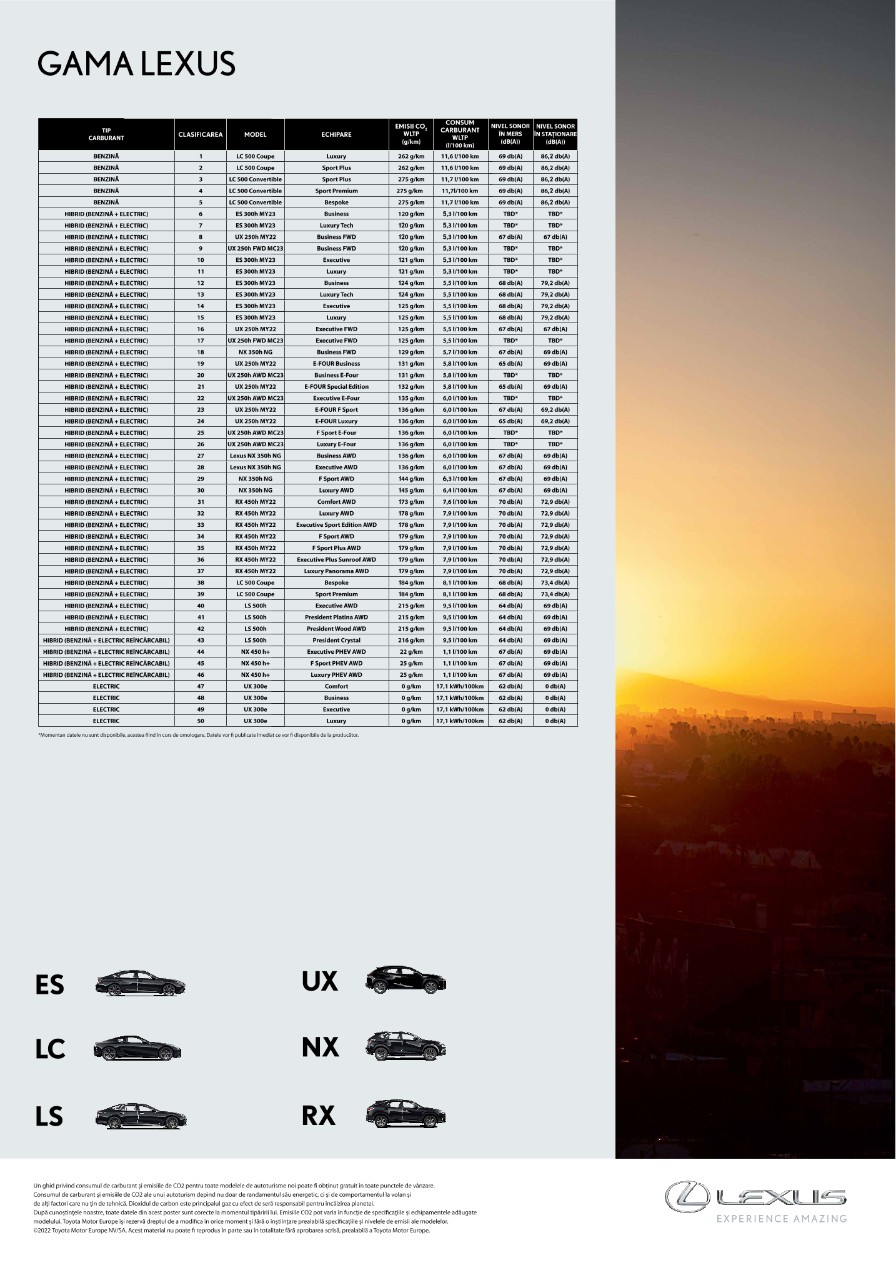 Tabel consum si emisii WLTP gama Lexus